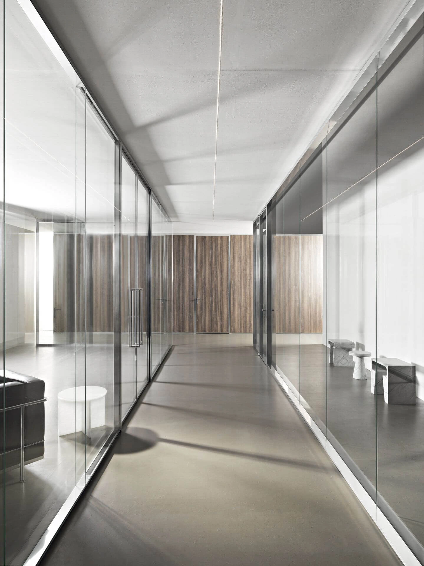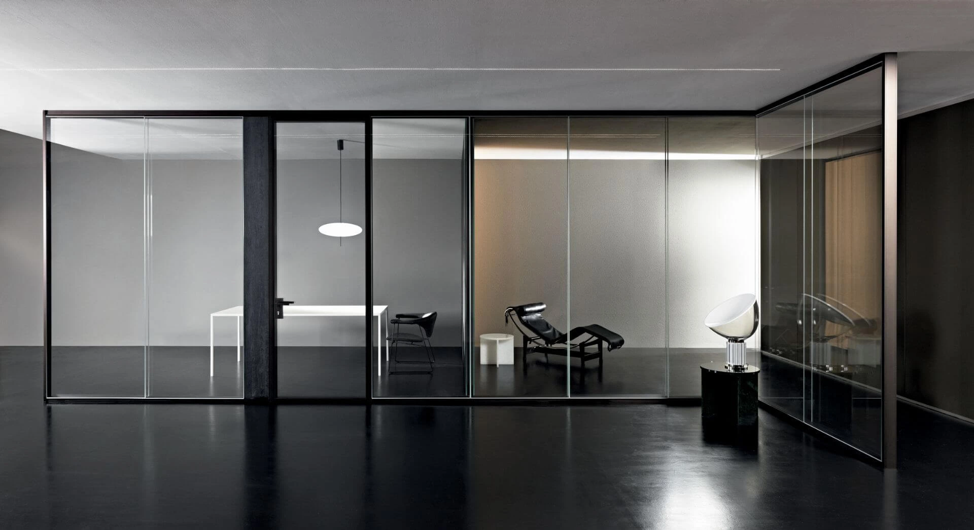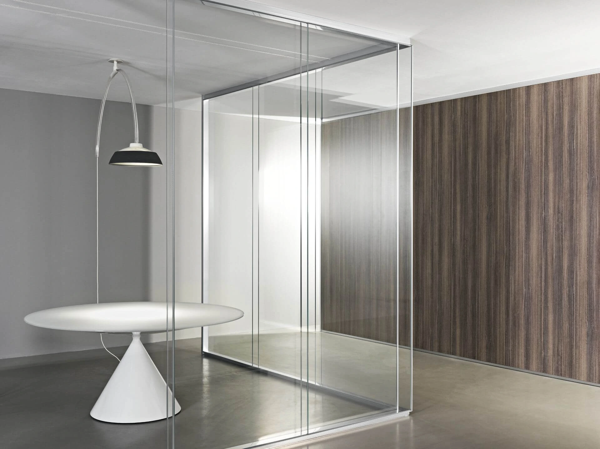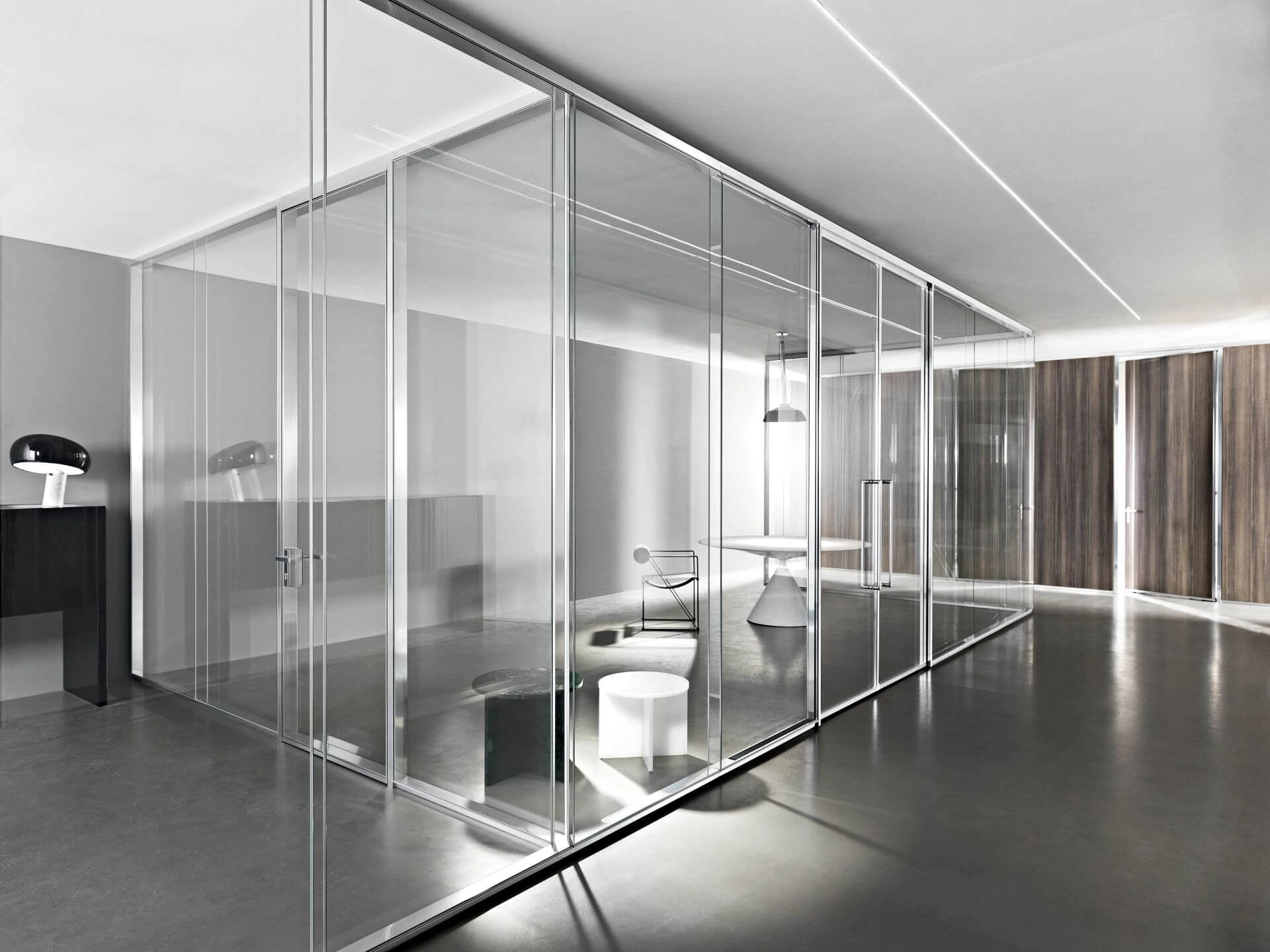 Steklene predelne stene so na voljo v različicah z enojnim steklom, dvojno zasteklitvijo ali enojnim zamaknjenim steklom. Prav tako pa lahko izbirate med različnimi aluminijastimi profili, kot so mat aluminij, črni ter beli aluminij. Poleg klasičnega transparentnega stekla je na izbiro tudi jedkano, neprozorno belo, s prozornim ali bronastim ter neprozornim ali sivim gradientom.